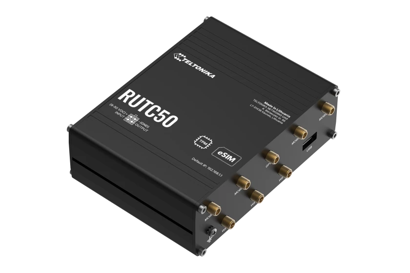Unleash the full potential of your edge applications with the RUTC50 5G router. This compact powerhouse combines ultra-fast 5G (up to 3.4 Gbps), dual-band Wi-Fi 6, and enhanced processing power with 1GB RAM and 8GB flash memory. Featuring dual SIM and eSIM for global, touch-free deployments, the RUTC50 delivers lightning-fast, low-latency communication for mission-critical operations. Rugged, powerful, and future-ready.