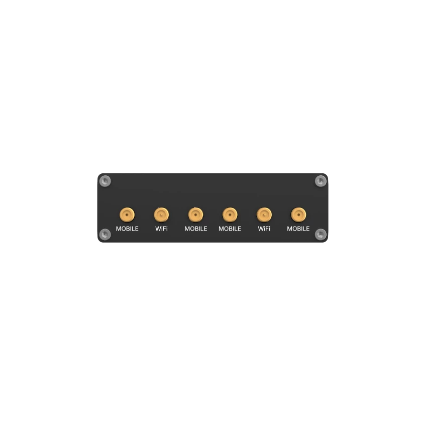 Ethernet: 2 x RJ45 10/100/1000 Mbps. I/O: 2 x digital I/O. LEDs: 1 x mobile connection type (RGB), 1 x mobile strength (RGB), 4 x LAN status, 1 x power. SIM: 2 x Mini SIM (2FF), 1.8V/3V, internal holders, optional eSIM. Power: 1 x 4-pin connector. Antennas: 4 x SMA Mobile, 2 x RP-SMA Wi-Fi. Reset: Reboot/User default/Factory reset.